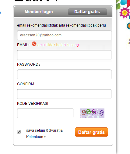 (Silahkan masukkan alamat email dan Password, lalu isi kode verifikasi, dan klik tombol “daftar gratis”).