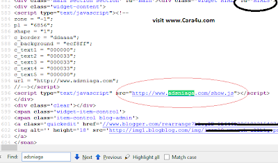 Selanjutnya, silahkan lakukan pencarian, ctrl + F dan masukkan nama web yang diredirect dari halaman blog sobat tadi. Dalam kasus ini, blog admin teredirect ke “adsniaga.com”, makanya disini admin mencari kata adsniaga.