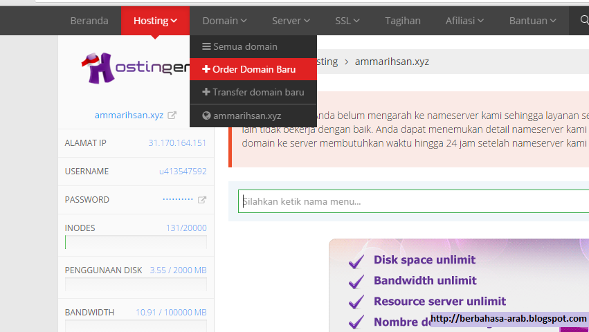 Next, silahkan daftar domain baru. Caranya, di menu paling atas idhostinger, silahkan pilih “domain“, lalu klik “order domain“.